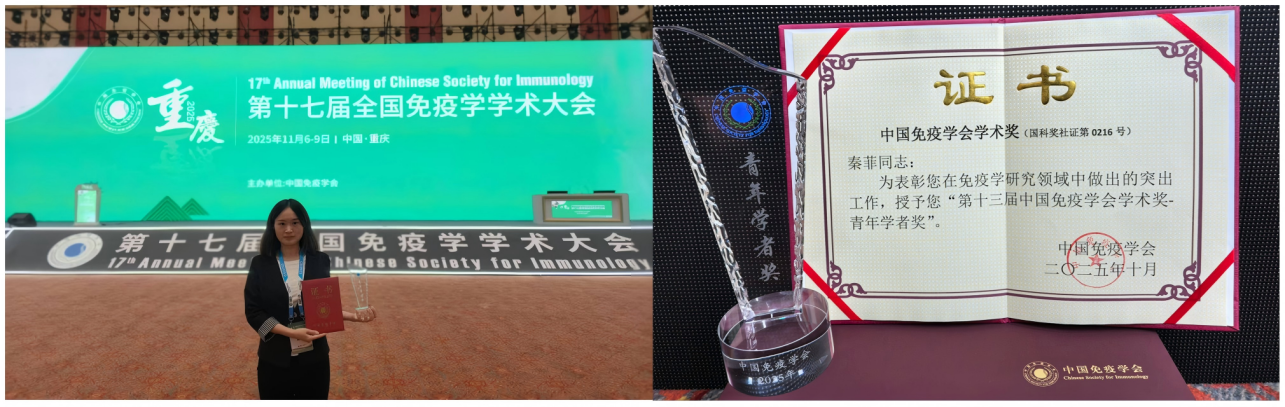 2025年11月6-9日,第十七届全国免疫学学术大会在重庆悦来国际会议中心召开。参会代表人数达到5000余人,是国内免疫学领域层次最高、覆盖面最广的学术盛会。会议期间,中国免疫学会颁发了第十三届中国免疫学会三大学术奖:终身成就奖1名、杰出学者奖2名和青年学者奖10名。公司太阳成tyc33455ccwww免疫学教研室青年教师秦菲荣获“第十三届中国免疫学会青年学者奖”。“中国免疫学会学术奖(国科奖社证第0216号)”的设立旨在表彰为我国免疫...