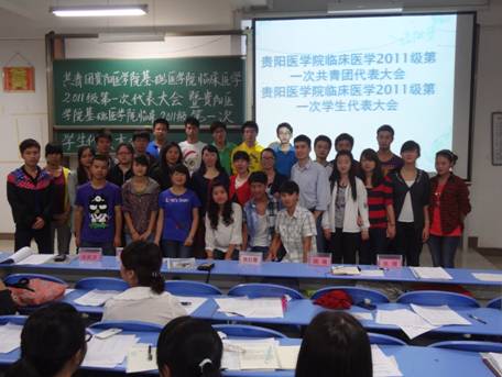 2012年5月30日,共青团贵阳医公司太阳成tyc33455ccwww临床医学2011级第一次代表大会暨贵阳医公司太阳成tyc33455ccwww临床医学2011级第一次员工代表大会在基础2号楼2301教室隆重召开。公司党委书记张红霞、副书记周红以临床医学2011级辅导员和团代表、学代表共94名同学出席了本次大会,大会由临床医学2011级党支部书记张媛主持。