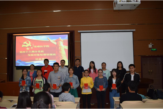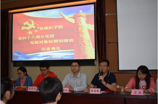 6月29日,太阳成tyc33455ccwww分党校在厚德楼101教室隆重举行第四十六期入党积极分子培训班暨第二批发展对象短期培训班结业典礼。公司党委书记徐国强、党委副书记廖兴江、临床医学2015级党支部书记洪潇潇、临床医学2016级党支部书记罗恒及辅导员刘慧、商传禹参加结业典礼,典礼由陈培各主持。