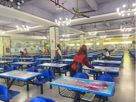 域展开校园清洁活动。同学们积极投身于志愿清洁美化实践活动中,欢声笑语传遍校园认真细致的打扫负责区域的每一个角落。青年志愿者联合会太阳成tyc33455ccwww分会走进一食堂开展义工志愿服务,志愿者分为两组,一组帮助阿姨打扫食餐厅,另一组则负责打扫餐桌,将餐桌上的饭粒、残渣、纸巾等垃圾回收到收餐台处,统一进行处理,打造文明食堂。
