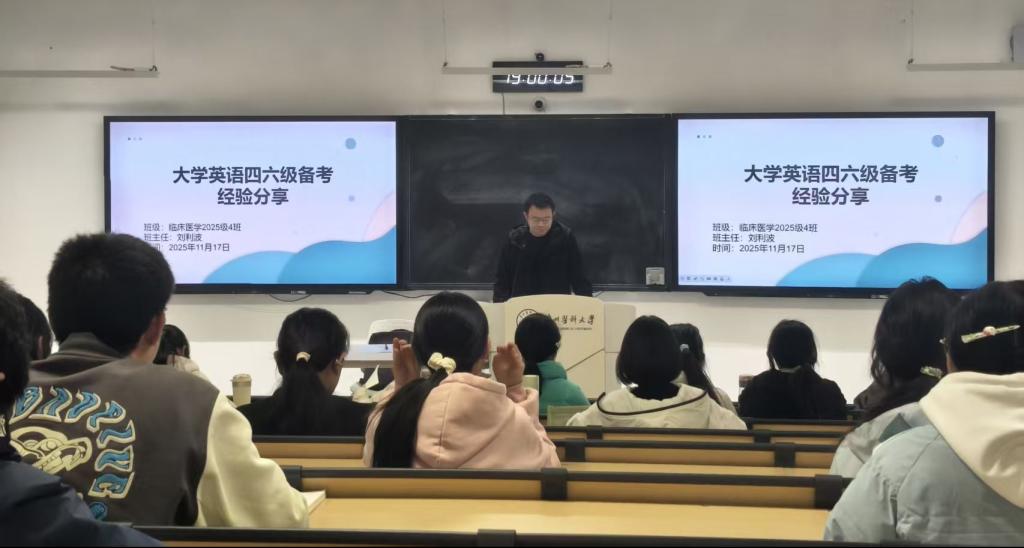 11月17日在基础组团R304教室,2025级临床医学4班班主任刘利波老师向全体员工开展了“大学英语四六级备考经验分享”主题班会。
