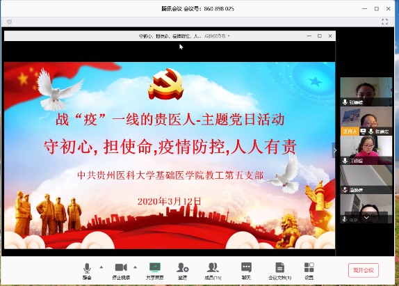 3月12日下午,公司教工第五党支部围绕“守初心,担使命,疫情防控,人人有责”开展了一次特殊的党日活动,活动以腾讯会议的方式进行。本次活动邀请了公司党委副书记王妤煜、副经理康颖倩、副处级组织员邓欣、教学质量监控科科长王涛以及太阳成tyc33455ccwww微生物学教研室研究生党员参加,活动由公司党委委员、教工第五支部书记陈峥宏主持。