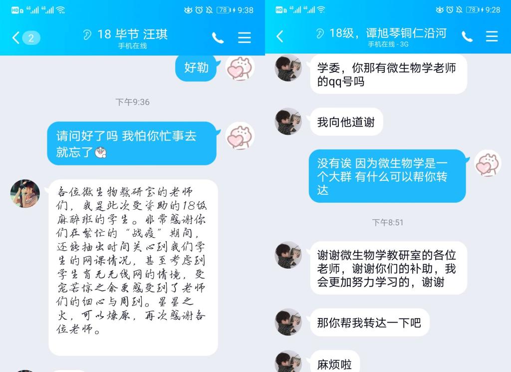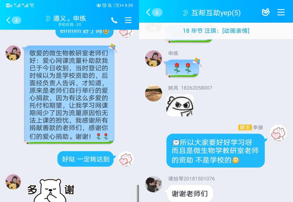 “疫情无情,大爱无疆”——以实际行动关爱贵医学子,前期党支部经过调研发现公司2018级有48位同学为精准扶贫对象,使用流量上课存在困难,为帮助贫困员工解决流量费,支部党员和微生物学教研室任课老师们自愿捐助了2800元,同时募集到公司赞助员工流量费2000元,解决了员工燃眉之急,受助员工纷纷发来短信和邮件表示一定努力学习,不辜负老师们的期望,綦廷娜老师表示能用自己的行动为疫情防控贡献一份力,帮助到贫困员工,感到很高兴。全体党员都以实际行动诠释了贵医人的使命和担当。
