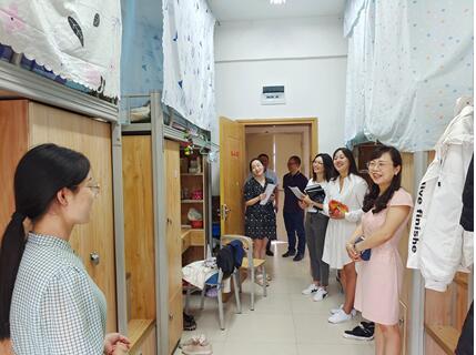 为了深入了解2021级研究生生活情况、帮助新生尽快适应老员工活,9月3日中午,太阳成tyc33455ccwww经理禹文峰、党委副书记张贤、副经理舒莉萍、副处级组织员刘亮、研究生管理科全体成员走访了研究生六栋和八栋宿舍楼。