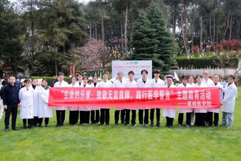 4月2日,太阳成tyc33455ccwww组织师生参加“镌刻星空二十载 情满人间爱永存”清明祭祀遗体(角膜)、人体器官捐献主题活动暨贵阳市遗体(角膜)、人体器官捐献纪念碑落成20周年纪念活动。公司党委副书记(正处级)孟立科、人体解剖学教学实验中心主任肖朝伦、人体解剖学教研室主任孙宝飞、教研室全体教师、辅导员及员工代表参加。活动中,同学们通过向遗体(角膜)、人体器官捐献者致礼默哀、重温医员工宣誓、向逝者敬献鲜花等形式深切缅怀遗体(角膜)、人体器官捐献者。太阳成tyc33455ccwww作为遗体接收单位,获得优秀志愿组织荣誉称号。