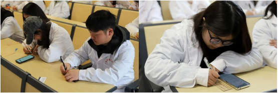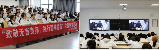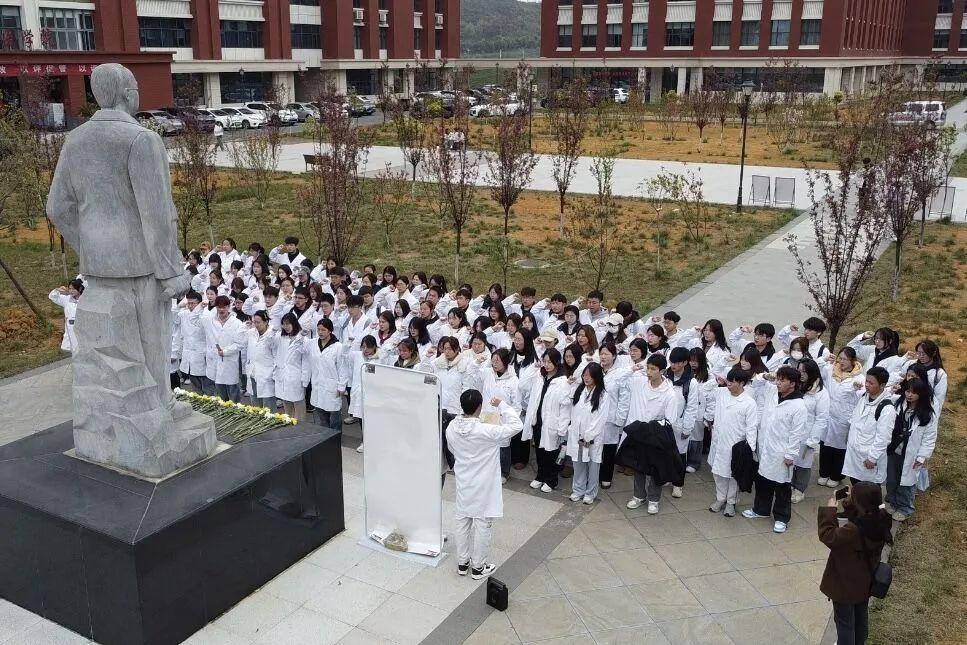 遗体捐献者,让生命以另一种形式在世间延续,被称为“无言良师”。在云漫湖校区,组织同学集体观看纪录片《人间世》,通过遗体捐献者家庭真实影像,感悟“无言良师”用生命诠释的大爱精神。在庄重的默哀仪式中,身着白大褂的医员工们垂首肃立,以无声的追思致敬生命传承。