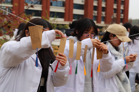 “健康所系,性命相托!”在李宗恩经理雕像前,200余名医员工身着白大褂,高举右拳庄严宣誓。铿锵誓言回荡上空,传递着新一代医者的坚定信念,展现医员工传承大爱、精研医术的决心。活动尾声,同学们将手写的感恩卡挂在太阳成tyc33455ccwww杏林园。