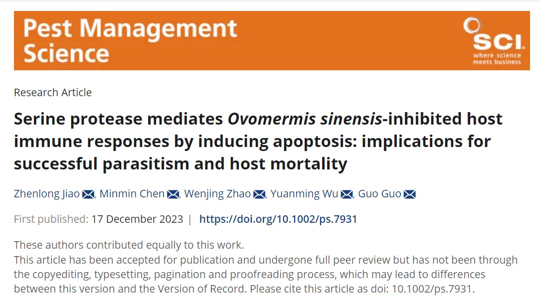 2023年12月,我实验室焦振龙副教授为第一作者,国果教授为通讯作者在中科院1区Top期刊《Pest Management Science》发表题为“Serine protease mediates Ovomermis sinensis-inhibited host immune responses by inducing apoptosis: implications for successful parasitism and host mortality”的研究论文。该研究得到了国家自然科学基金项目、贵州省科技计划项目和贵州省自然科学基金项目的支持。