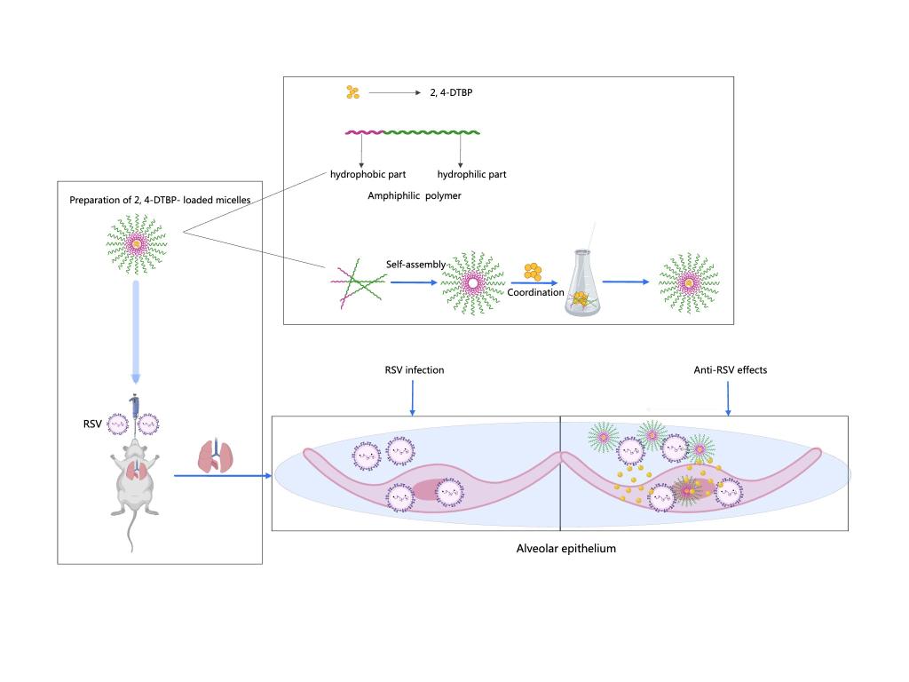 人呼吸道合胞病毒(RSV)是常见的经呼吸道传播的嗜肺病毒之一,RSV感染可导致急性下呼吸道感染(ALRTI)甚至死亡,是婴幼儿和老年人呼吸道感染的常见病因。然而,目前大多数国家都缺乏有效的治疗方法或疫苗,因此安全有效的抗病毒药物开发迫在眉睫。2,4-二叔丁基苯酚(2,4-DTBP)是本课题组在鱼腥草中分离发现的一种具有抗病毒活性的小分子化合物,但水溶性较低。我们采用高分子材料胶束包载制备了2,4-DTBP负载胶束以提高其溶解性,并通过吸入方式给药检测其抗病毒效果。我们发现 2, 4-DTBP 负载胶束在体外显著抑制RSV 感染,并显著提高了 RSV 感染小鼠的存活率和病毒清除率,改善了肺部炎症和病理损伤。本研究首次报道了 2, 4-DTBP 负载胶束体内外显著的抗RSV感染效果,为临床 RSV 感染提供了一种潜在的治疗方案。该研究为临床药物开发提供了宝贵的实验证据,并对中草药民族药更全面、更有针对性和更现代化的研究颇有助益。