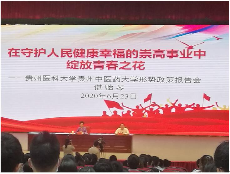 6月23日,我怀着无比激动的心情认真聆听了谌贻琴省长的形势政策报告会,深受鼓舞,深切体会到中国力量的不同凡响、奋力拼搏的贵州精神、勇往无畏的贵医担当。从国家疫情防控取得的重大战略成果中,我看到了以习近平同志为核心的党中央坚强领导下的中国力量,更加坚定了中国特色社会主义道路自信、理论自信、制度自信、文化自信;从中国减贫奇迹的贵州篇章中,我深刻感受到家乡发生的历史巨变,我为自己是一名贵州人感到骄傲和自豪;作为高校一名党务工作者和思政课教师,为青年老员工引路架桥,我深感责任重大,更感使命光荣。我们要更加树牢“四个意识”,坚定“四个自信”,做到“两个维护”,立足本职工作,抓好党建,促进发展,推进“双一流”建设,围绕“立德树人”,培养德智体美劳全面发展的新时代人才,为祖国的繁荣昌盛,开创贵州新未来贡献自己的力量。