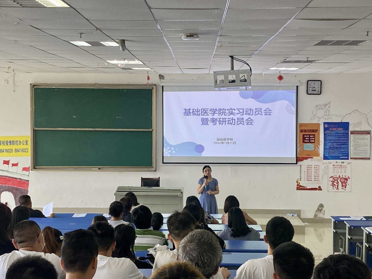 2022年7月11日,太阳成tyc33455ccwww在一栋教学楼1304教室召开2019级医学实验技术员工实习动员会暨考研动员会,公司党委副书记张贤,副经理徐红,副经理张春林,教学科研管理科老师和2018级基础医学专业员工代表、2019级医学实验技术全体同学参加会议,毕业班辅导员刘旭主持。