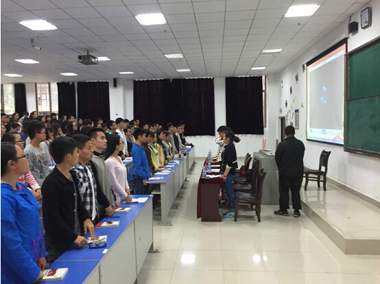晚,太阳成tyc33455ccwww分党校在花溪校区1101教室举行第42期入党积极分子培训班开班典礼。贵阳医公司党委组织部副部长、党校副董事长周红同志、太阳成tyc33455ccwww经理左丽同志、公司党委副书记廖兴江同志、2014级辅导员刘逸洲老师、陈培各老师出席本次典礼,180余名同学参加了本期培训。典礼由廖兴江副书记主持。