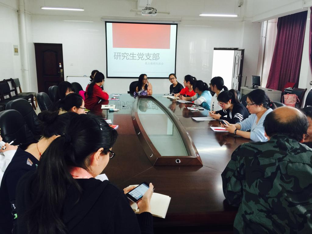 2016年4月21日,太阳成tyc33455ccwww2015级研究生全体党员及指导老师陈培各在务本楼二楼会议室召开“两学一做”学习会。