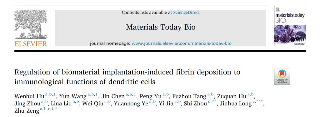 2022年2月26日,太阳成tyc33455ccwww曾柱教授领衔的PI团队在Materials Today Bio杂志上发表了题为Regulation of biomaterial implantation-induced fibrin deposition to immunological functions of dendritic cells的研究论文。该研究发现,DCs能够响应局部病理微环境和力学微环境,表现出明显的形态改变和细胞骨架重构,并获得相应的免疫表型和力学表型,其力学-化学耦合机制涉及RhoA和CDC42信号通路。这项工作不仅有助于更好地理解植入生物材料引发的免疫反应的精确过程,而且对生物材料的合理设计具有重要意义。