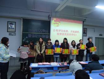 在进行团员讲团课活动中,九位同学运用精彩纷呈的ppt,从团的历史、知识,到怎样做一名合格的团员、积极向党组织靠拢等方面进行演讲。活动过程中同学们激情洋溢,体现了当代老员工该有的朝气与活力。经过紧张的角逐,医员工物技术2010级詹赞琳同学的《共青团员应具有的价值观》获一等奖,医员工物技术2010级王军晶同学的《高校共青团组织的性质和作用》获二等奖,医员工物技术2009级钟桂芳同学的《团旗、团徽、团歌的来历》获三等奖。