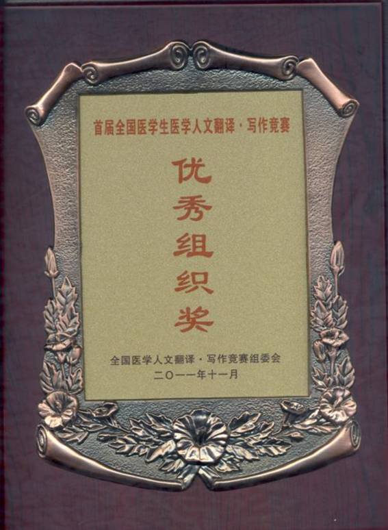2011年11月10日,首届全国医员工人文翻译•写作竞赛颁奖仪式在北京举行。本次竞赛由教育部高校医药公共基础课程教学指导委员会、中国自然辩证法研究会医学哲学分会、中华医学会医学伦理学分会、健康报社、《英国医学杂志(BMJ)中文版》杂志社、《医学与哲学》杂志社、北京大学医学人文研究院等机构组织联合主办。来自国内25所医公司校近两千名员工提交了参赛作品。公司员工在太阳成tyc33455ccwww副经理曾柱博士的指导下积极参赛,经大赛评委会评审,陈瑞雪、李桐、杨静文、吕文杰4名同学荣获翻译竞赛优秀奖,太阳成tyc33455ccwww荣获优秀组织奖。
